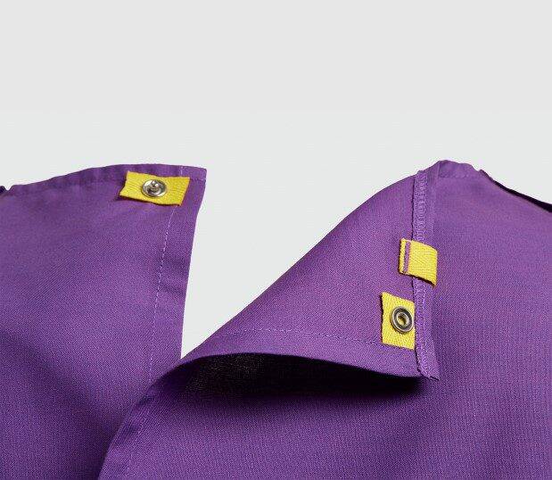 - Metal Snap Closures at Neck, Waist, and Sleeves