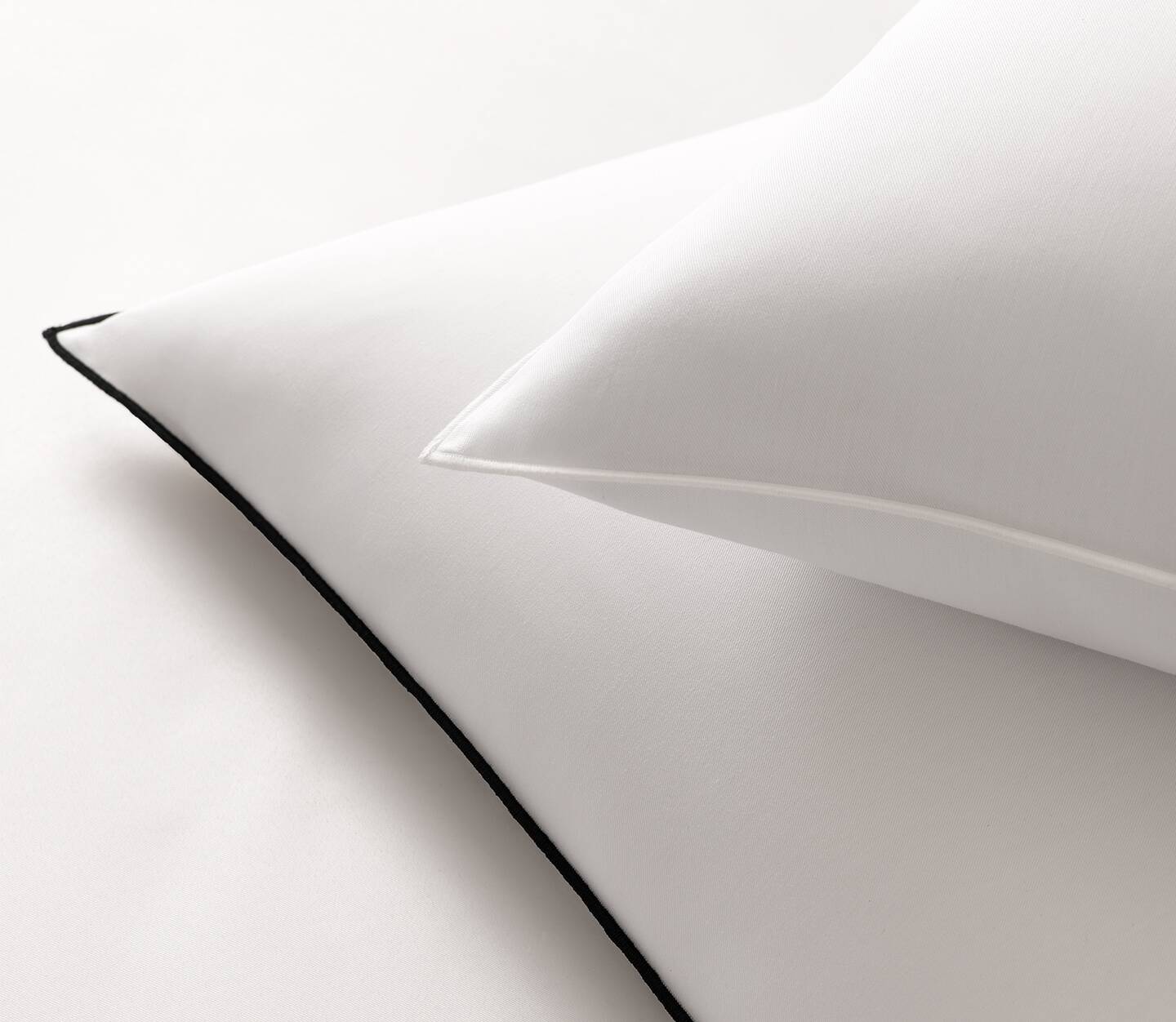 - Pillowcases: Available in Standard, Queen, or King with open end or Designer Closure style. Open end pillowcases feature single line white festooning at hem, while Designer Closure pillowcases feature an embroidered edge trim in your choice of white or black.