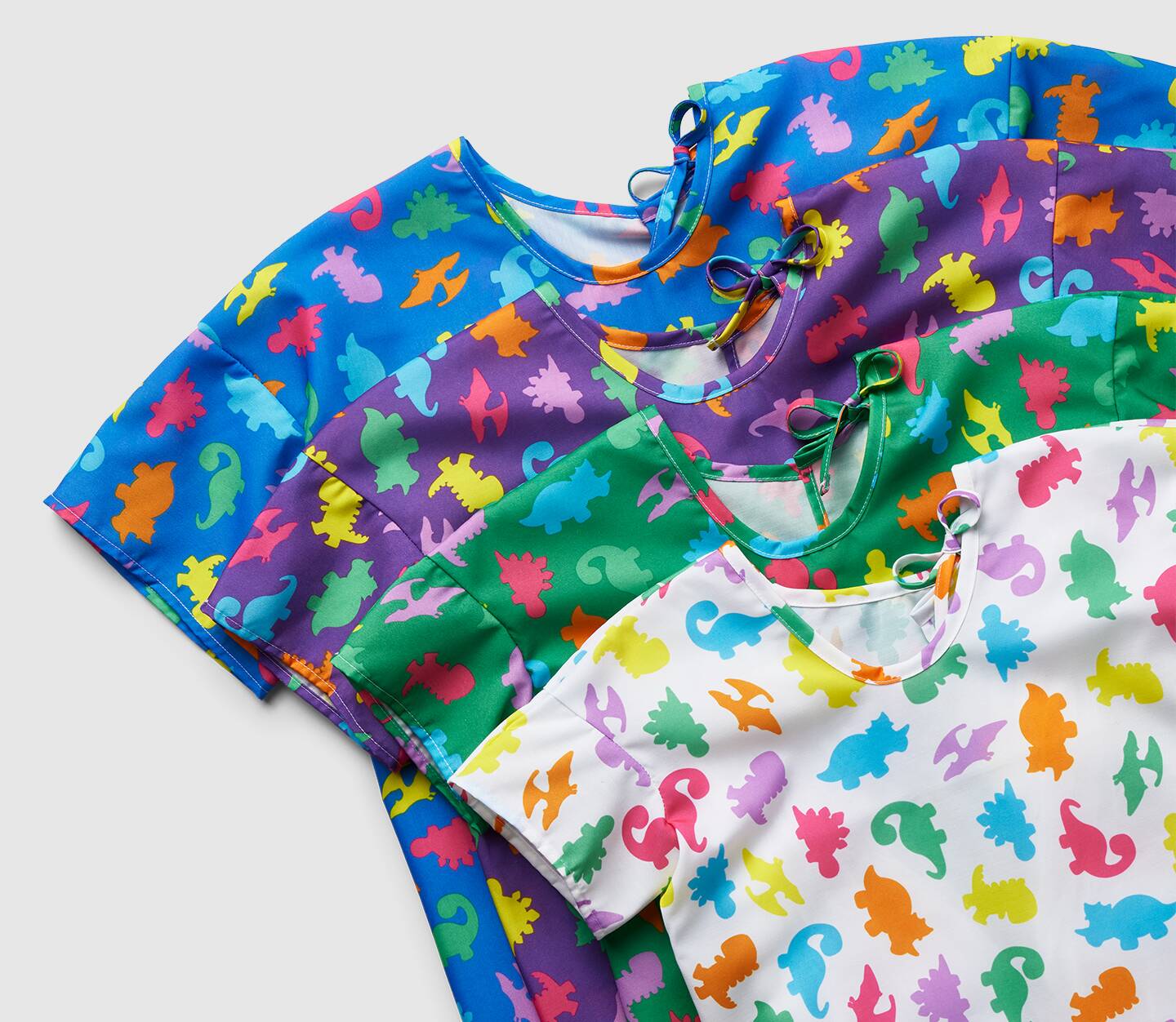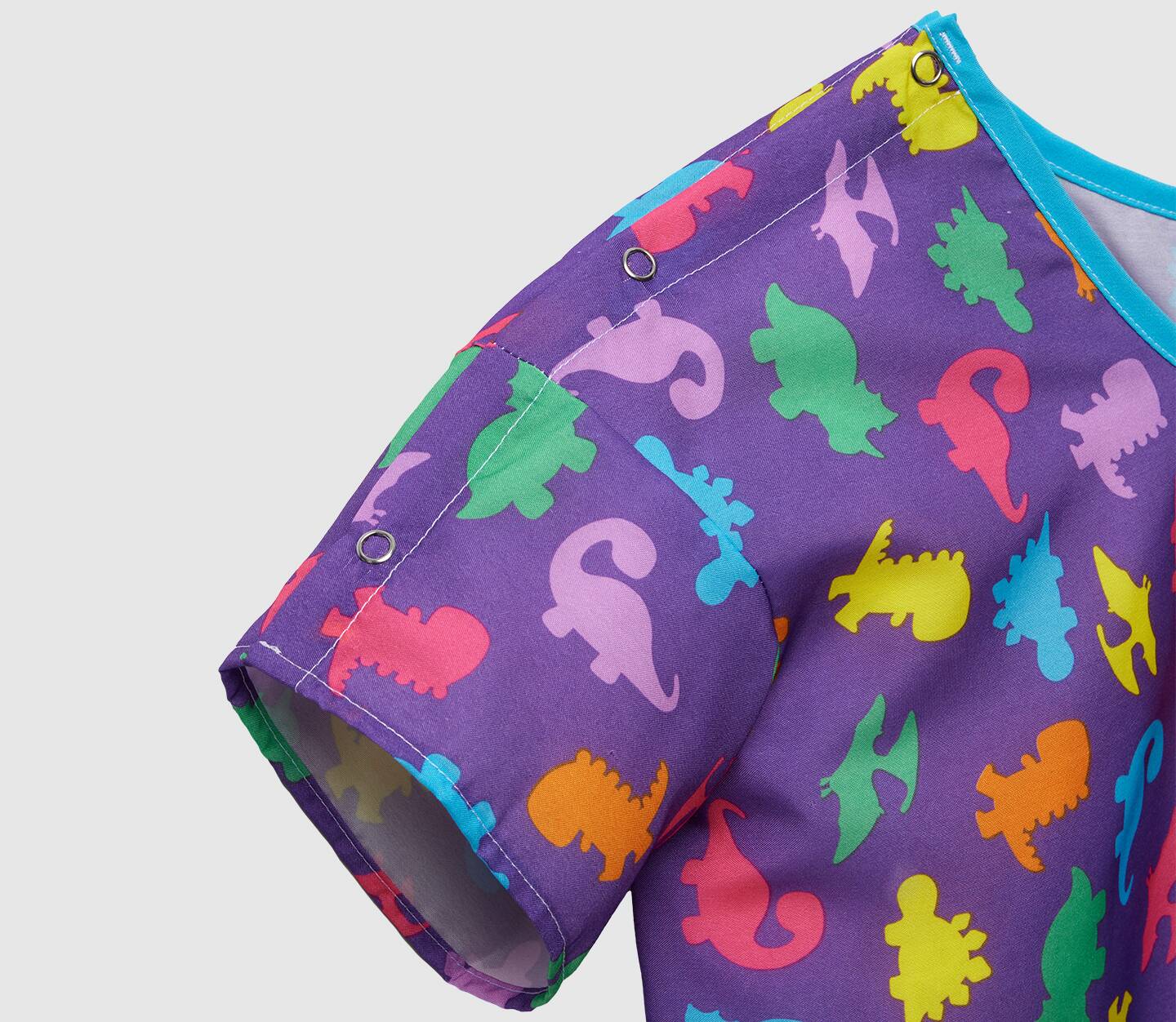 DinoDreams™ Pediatric Patient Gowns feature our popular ChildGuard™ fabric, which is 100% woven FR Polyester that is California Prop 65 compliant and meets U.S. federal flammability requirements for children’s sleepwear. These children’s hospital gowns have the look and feel of adult patient wear and provide the same levels of comfort and quality.