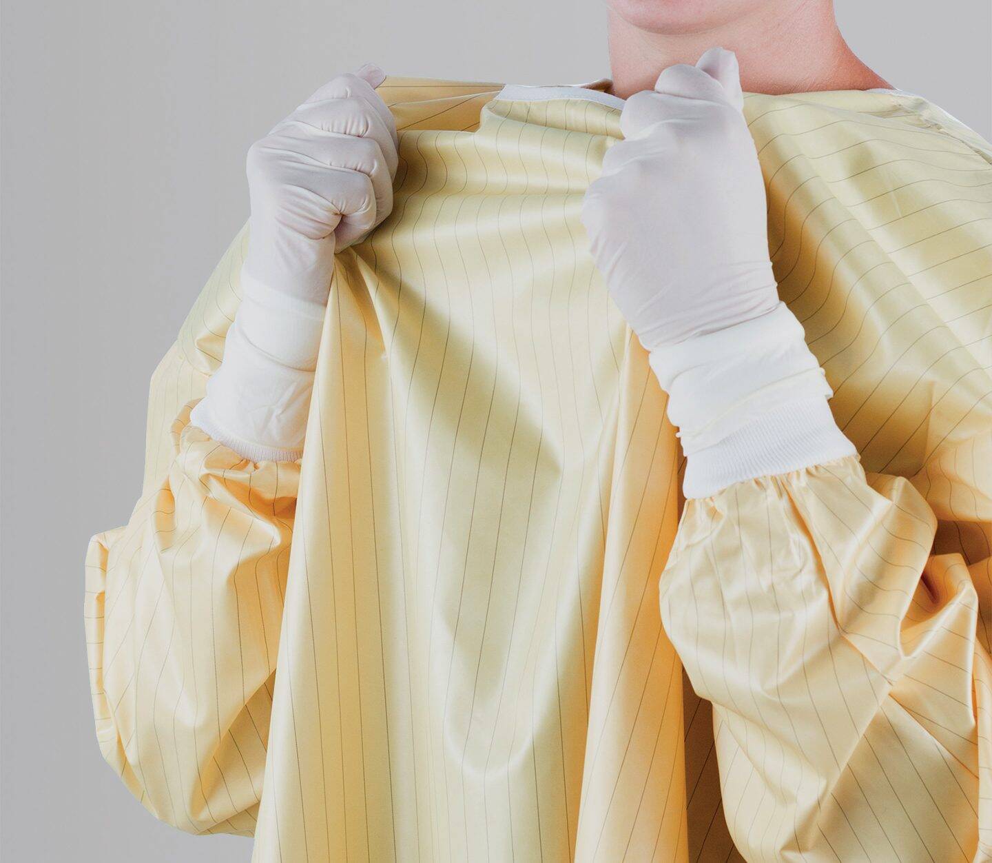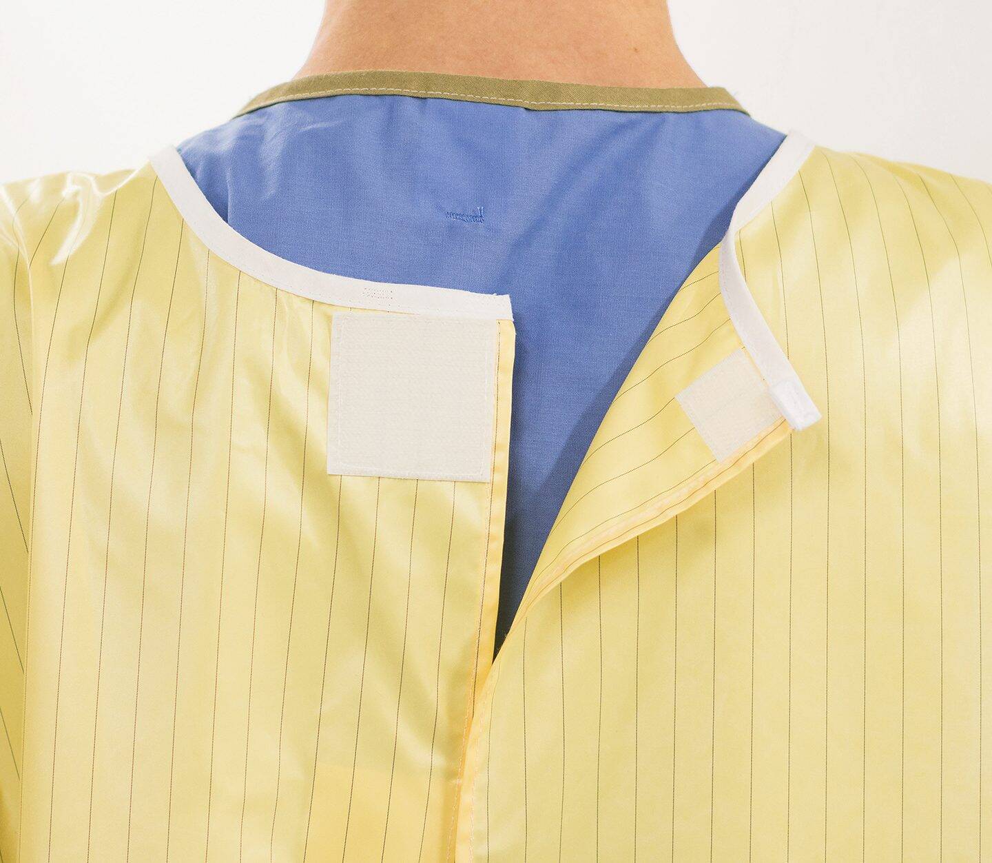 - A patented proprietary specification hook and loop closure at neck and waist, reducing potential for contamination in donning and doffing.