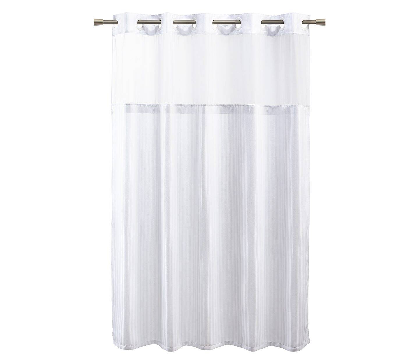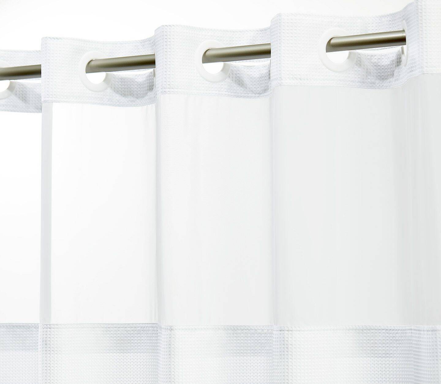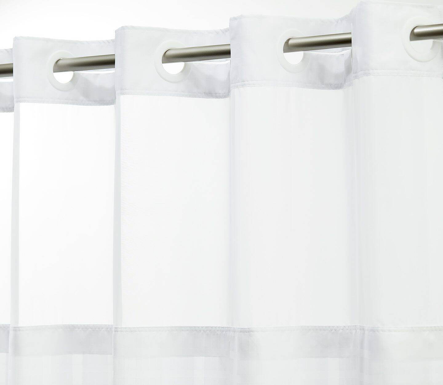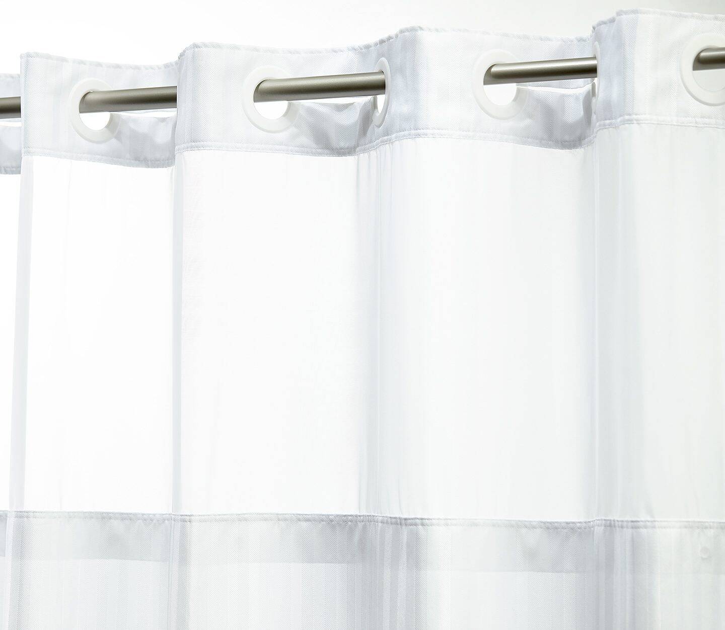 - Polyester hook-free shower curtains available in three versatile, white-on-white patterns