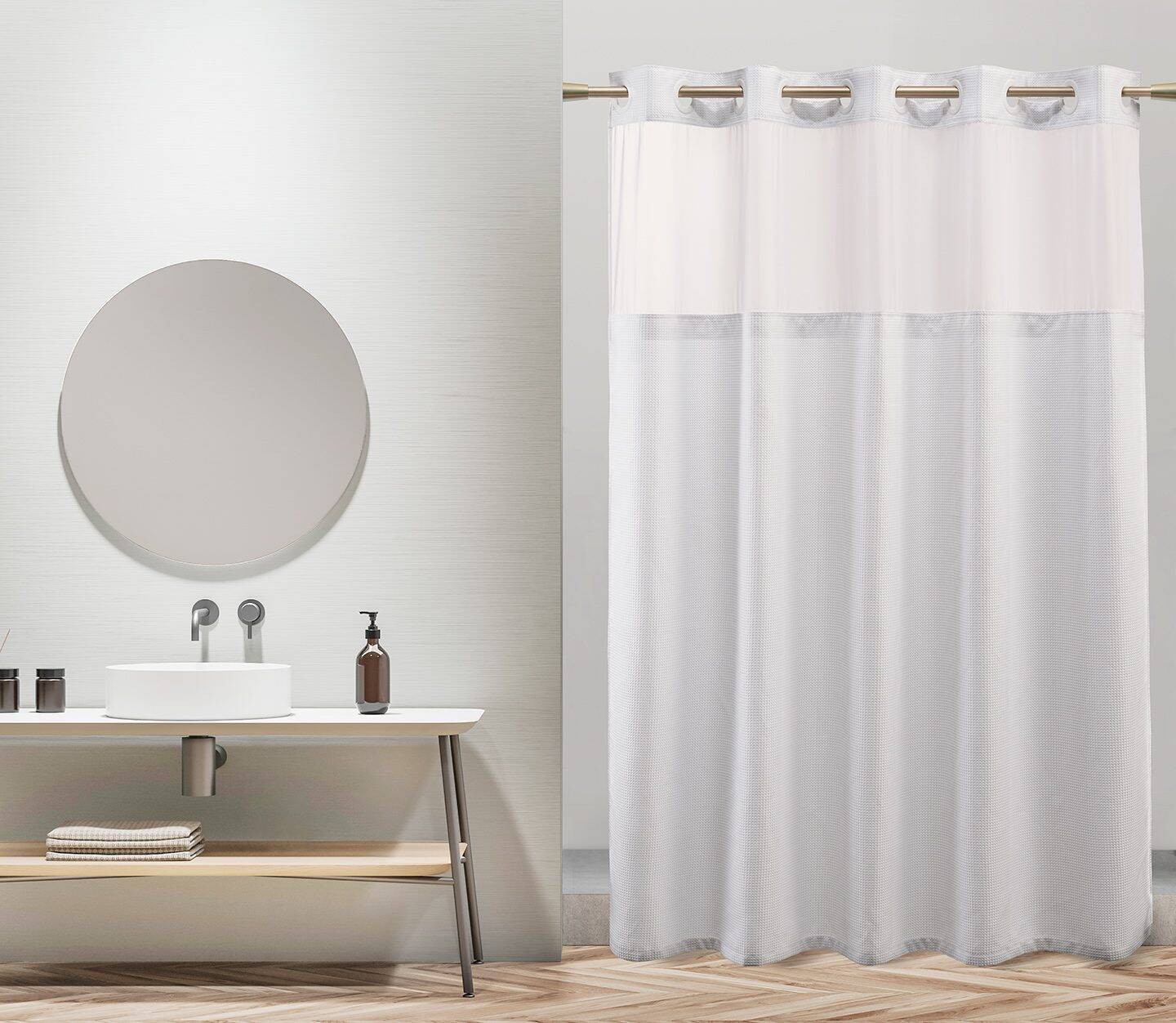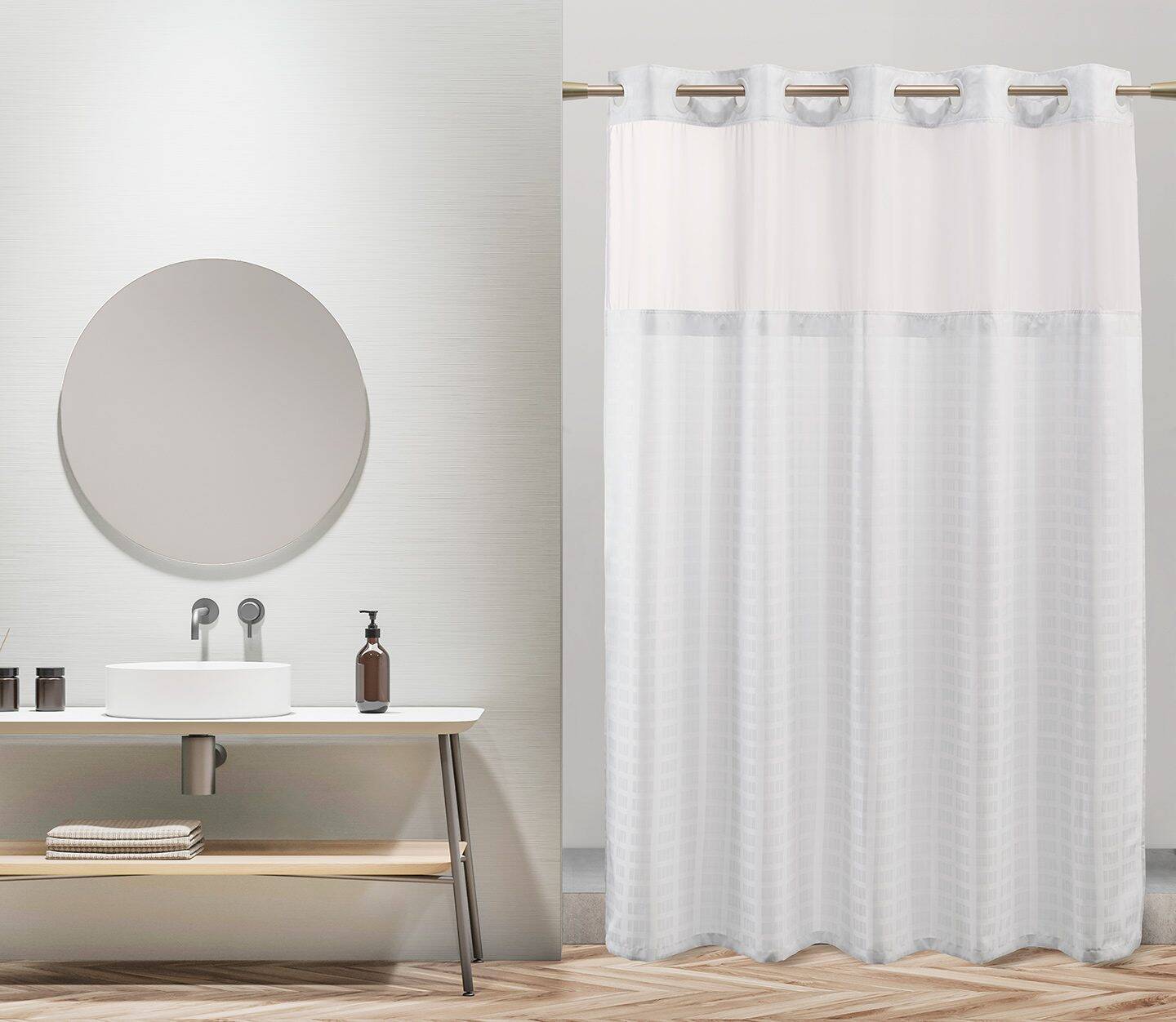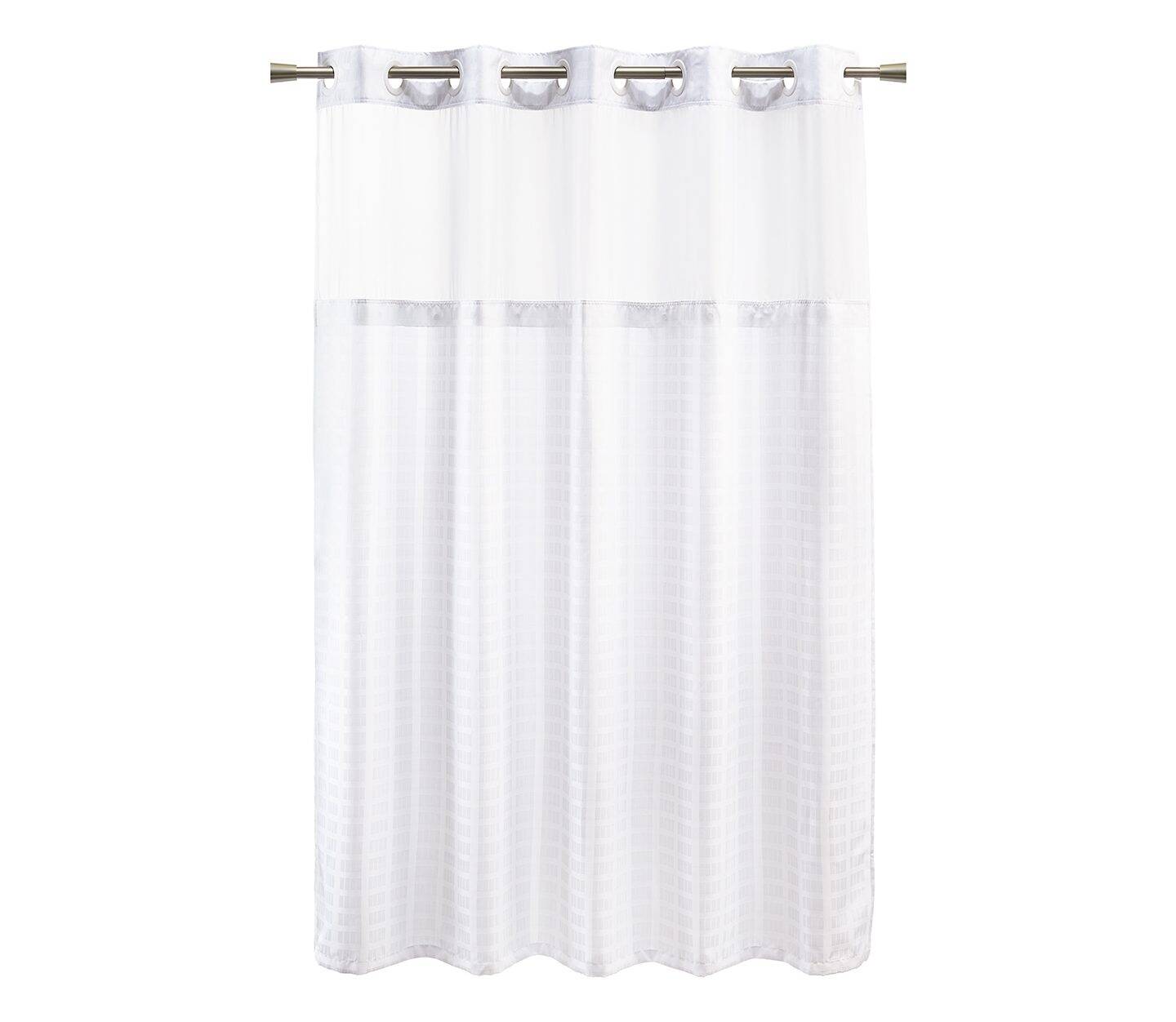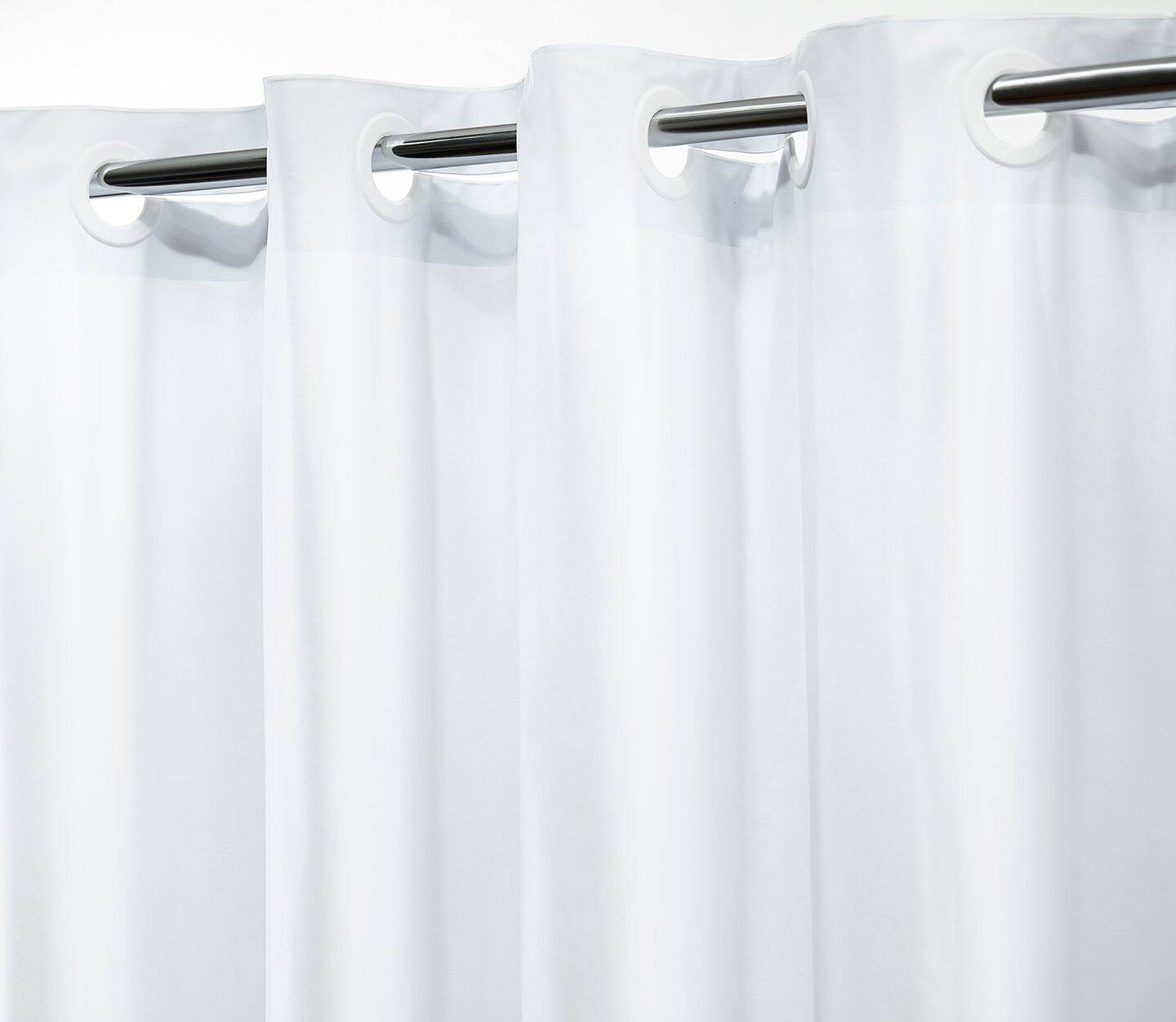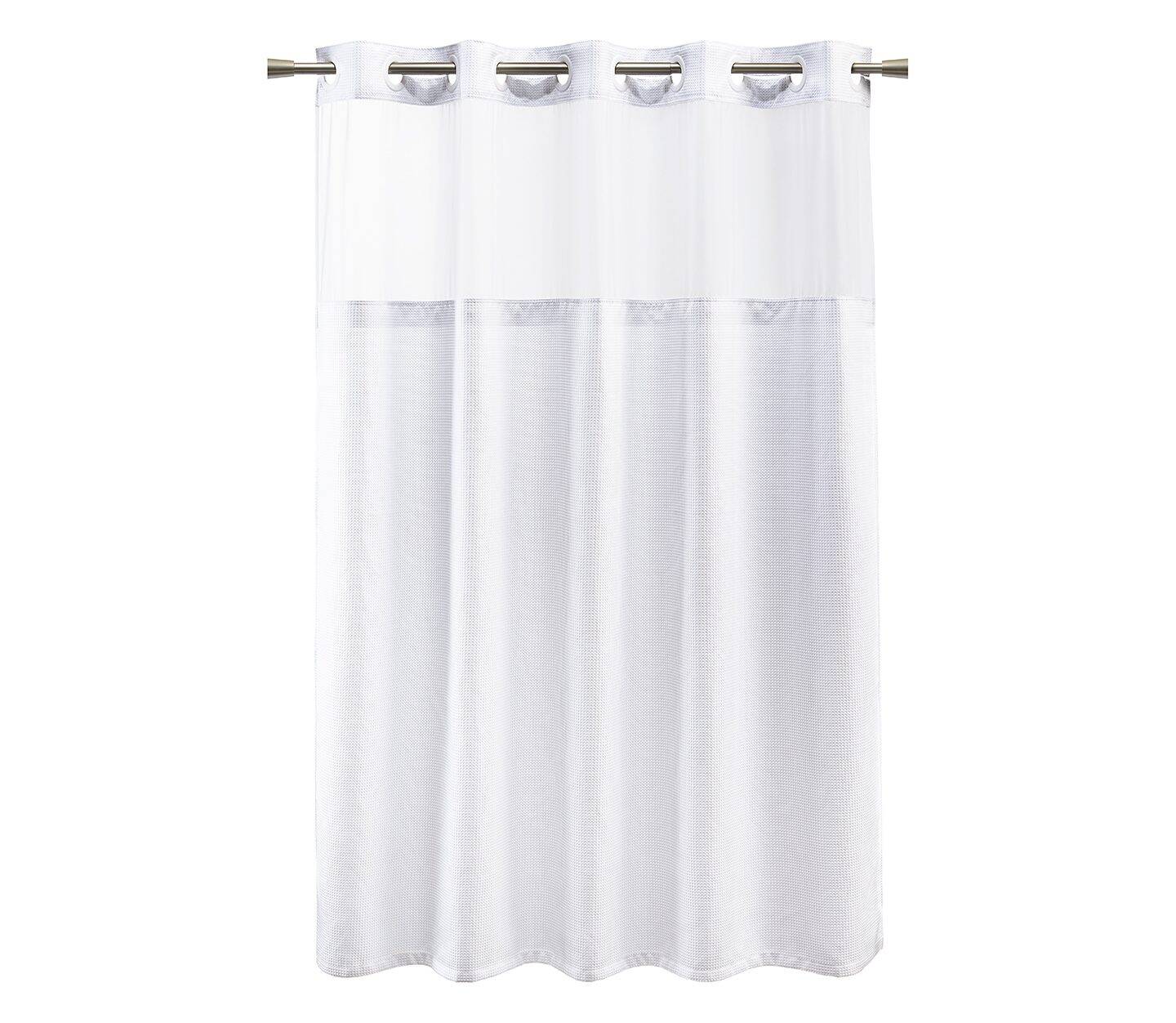 - Polyester hook-free shower curtains available in three versatile, white-on-white patterns