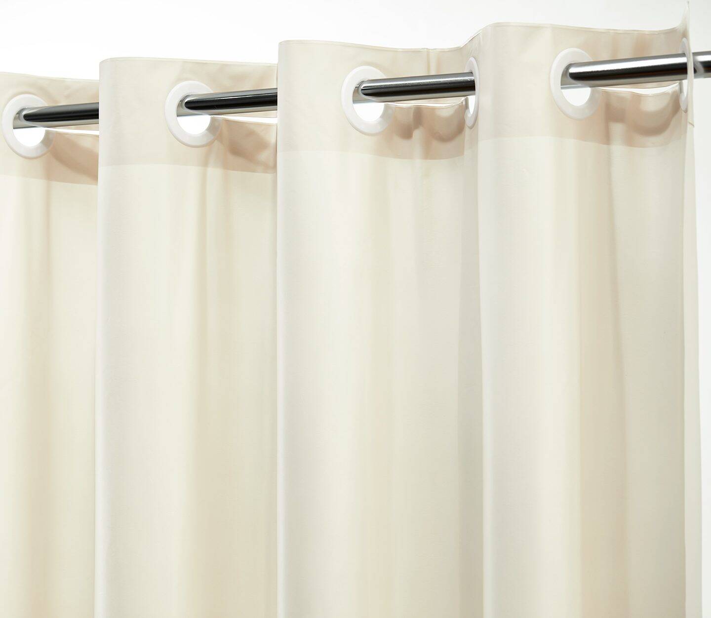 Rich in texture, our stocked hook-free shower curtains—available in either 100% Polyester or 10-gauge vinyl—deliver time-saving convenience along with durable beauty. The built-in, flexible white rings allow for quick, easy installation and removal in less than 45 seconds.