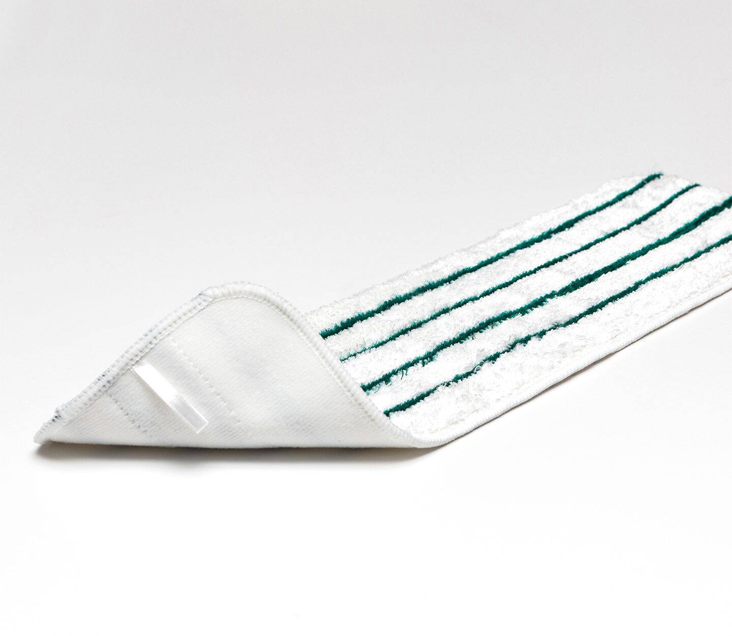 Our microfiber wet mop pads feature a merrowed edge with rounded corners and brushed polyester backing. Made with 70% Polyester/20% Polyamide/10% Polypropylene, these wet mop pads are available in an 18” size with green polypropylene scrubbing lines.