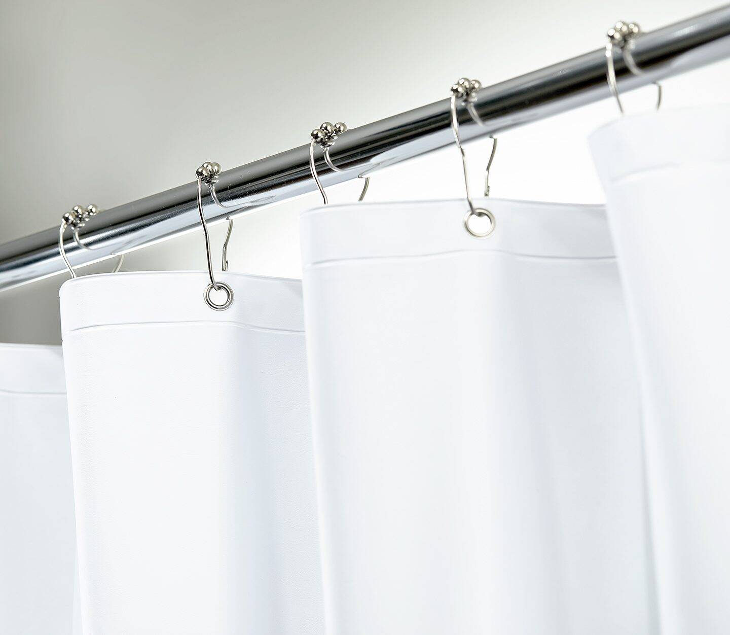 Pair our shower curtain hooks with our water repellent hooked polyester fabric shower curtain liner (both sold separately) to provide a complete protection barrier in your bathroom. Topped with sewn eyelets and finished with corner weights, our 100% Polyester hooked shower curtain liner and stainless-steel shower curtain hooks work together to make your bath complete.
